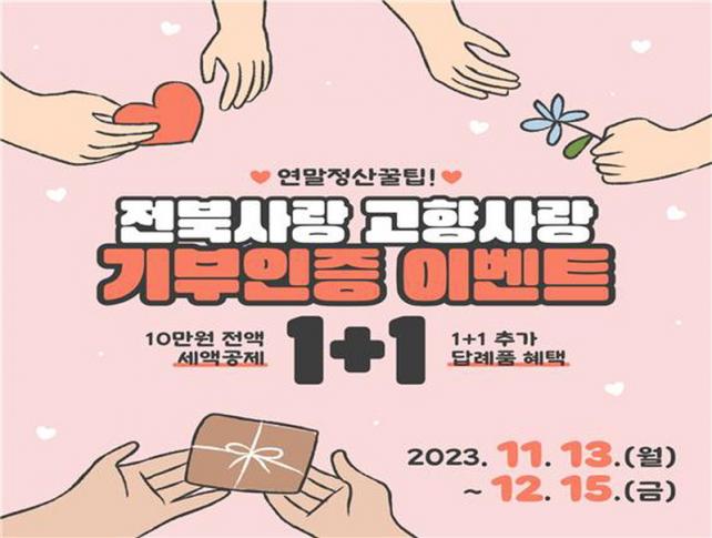 À̺¥Æ®´Â 11¿ù 13ÀϺÎÅÍ 12¿ù 15ÀϱîÁö ÁøÇàµÇ¸ç °íÇâ»ç¶ûeÀ½ »çÀÌÆ®(www.ilovegohyang.go.kr)¶Ç´Â NH³óÇù¿¡ ¹æ¹®ÇØ ÀüºÏµµ¿¡ 10¸¸¿ø ÀÌ»ó ±âºÎ ÈÄ ´ä·Êǰ ½Åû*±îÁö ¿Ï·áÇϸé ÀÚµ¿À¸·Î ÀÀ¸ðµÈ´Ù.