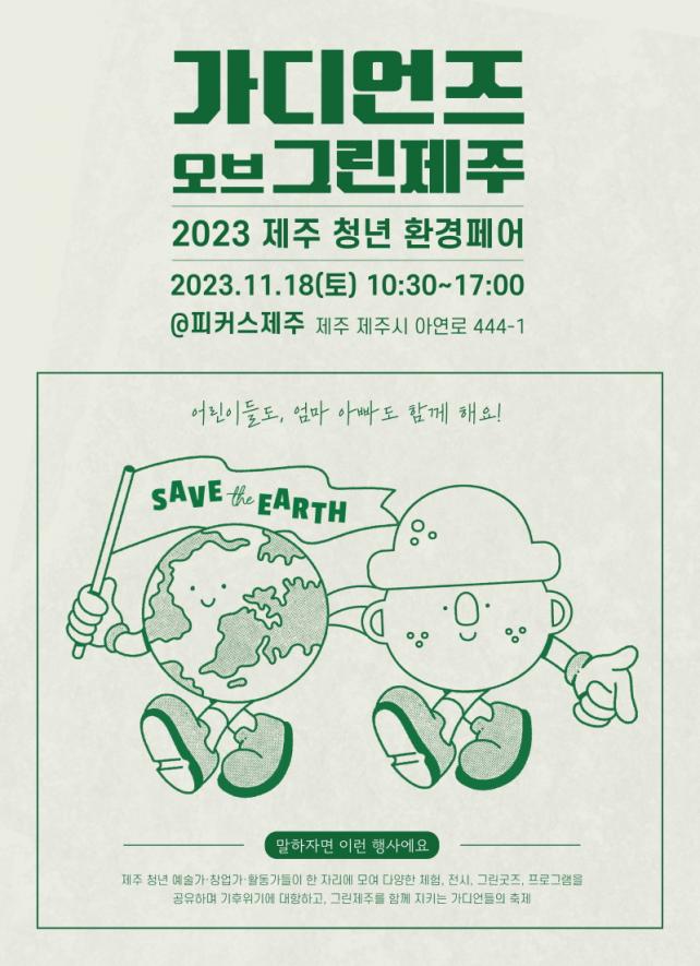 û³âÀÌ Á¦¾ÈÇÏ°í ±âȹÇÑ Á¦ÁÖ Ã»³â ȯ°æÆä¾î ¡®°¡µð¾ðÁî ¿Àºê ±×¸° Á¦ÁÖ¡¯°¡ ¿À´Â 18ÀÏ ¿ÀÀü 10½Ã 30ºÐºÎÅÍ ÇÇÄ¿½º Á¦ÁÖ(Á¦Áֽà ¾Æ¿¬·Î 444-1)¿¡¼ °³ÃֵȴÙ. û³â±âȹ´ÜÀÌ Á¦½ÃÇÑ ¡®°¡µð¾ðÁî ¿Àºê ±×¸° Á¦ÁÖ¡¯´Â ±âÈÄÀ§±â·Î Èûµé¾îÇÏ´Â Áö±¸¸¦ ÁöÄѳª°¡ÀÚ´Â Àǹ̸¦ ´ãÀº ½½·Î°ÇÀÌ´Ù.