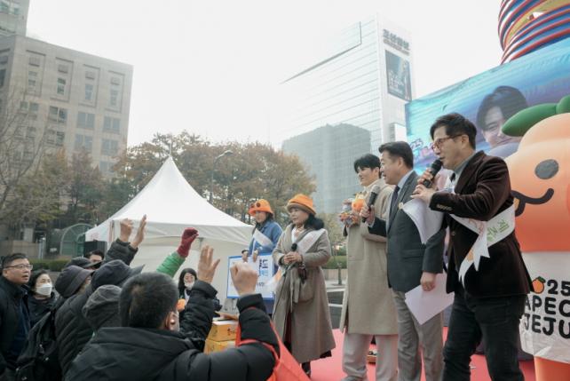 ¿À¿µÈÆ Á¦ÁÖµµÁö»ç¿Í Á¦ÁÖ °íÇâ»ç¶û±âºÎ È«º¸´ë»çÀÎ ¹è¿ì ÀçÈñ¾¾°¡ À̳¯ Çà»çÀå¿¡¼ ÄûÁ ³»°í È«º¸¹°Ç°À» ÁõÁ¤ÇÏ´Â ±ô¦ À̺¥Æ®¸¦ ÁøÇàÇßÀ¸¸ç, È«º¸ ºÎ½º µîÀ» µÑ·¯º¸¸ç ¹æ¹®°´µé¿¡°Ô Á¦ÁÖ °íÇâ»ç¶û±âºÎ Âü¿©¸¦ µ¶·ÁÇϰí 2025 ¾Æ½Ã¾ÆÅÂÆò¾ç°æÁ¦Çù·Âü(APEC) Á¤»óȸÀÇ Á¦ÁÖ À¯Ä¡µµ È«º¸Çß´Ù.