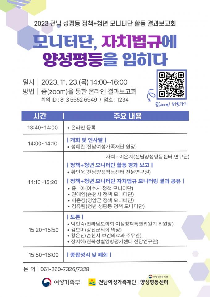 Àü³²¿©¼º°¡Á·Àç´Ü ¼ºÇý¶õ ¿øÀåÀº ¡°Áö¿ª µµ¹Î Áß½ÉÀÇ Á¤Ã¥¸ð´ÏÅ͸µ »ç¾÷Àº Á¤Ã¥ ¿î¿µ¿¡ ÀÖ¾î¼ ¹Î°ü °Å¹ö³Í½ºÀÇ Á߿伺À» ȯ±âÇÏ°í µµ¹ÎÀÇ ¼ºÀÎÁö ¿ª·®°È¿¡ ÀÏÁ¶Çϰí ÀÖ´Ù¡±¶ó¸ç, ¡°Àü³²ÀÇ Áö¿ª»çȸ°¡ ¼ºÆòµîÀ» Áß¿äÇÑ °¡Ä¡·Î ÀνÄÇØ ¸ð´ÏÅ͸µ Ȱµ¿ °á°ú°¡ ½ÇÁúÀûÀÎ Á¤Ã¥À¸·Î ¹ßÆÇÀÌ µÇ¾úÀ¸¸é ÁÁ°Ú´Ù¡±¶ó°í ¹àÇû´Ù.