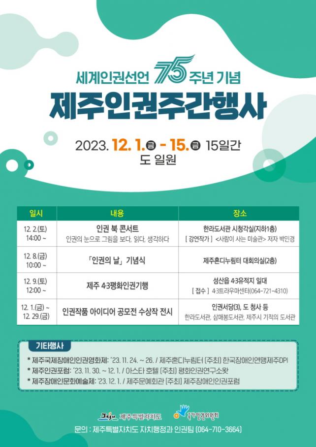 Á¦ÁÖµµ¿Í ±¹°¡ÀαÇÀ§¿øÈ¸ Á¦ÁÖÃâÀå¼Ò°¡ °øµ¿À¸·Î ÁÖÃÖÇÏ´Â À̹ø Çà»ç´Â µµ³» ÀαÇÁ¸Áß ºÐÀ§±â È®»êÀ» À§ÇØ À뱂 °ü·Ã ºÏ ÄܼƮ, ÀαÇÀÇ ³¯ ±â³ä½Ä, Á¦ÁÖ4¡¤3ÆòÈÀαDZâÇà µî ´Ù¾çÇÑ ¹®ÈÇà»ç°¡ °³ÃֵȴÙ.