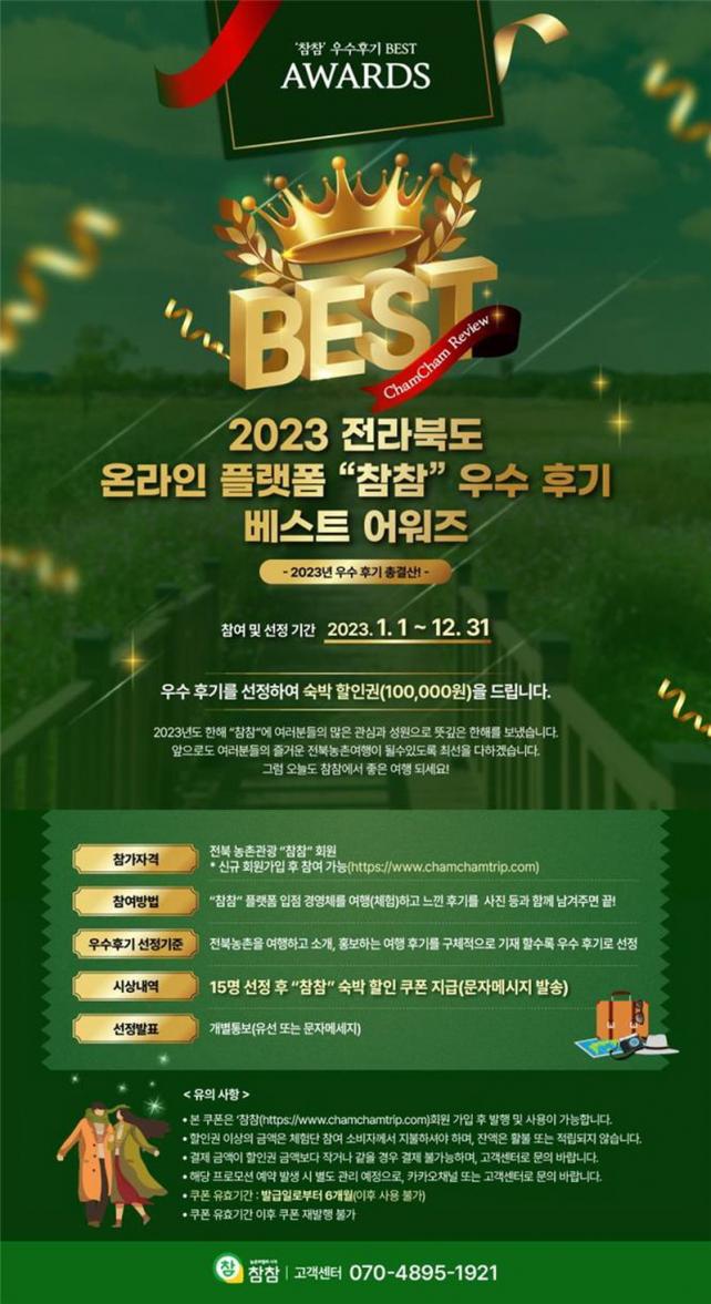 À̹ø ¿¬¸» À̺¥Æ®´Â ¿Â¶óÀÎ Ç÷§Æû ¡®ÂüÂü¡¯À» ÇѹøÀÌ¶óµµ ÀÌ¿ëÇÑ È¸¿øÀ̶ó¸é ´©±¸³ª ¾î¿öÁî À̺¥Æ®¿¡ Âü¿©ÇÒ ¼ö ÀÖÀ¸¸ç, ÀÛ¼ºÇØ ÁֽŠÈıâ Áß ¼±Á¤ÇÏ¿© ÀÛ¼ºÀÚ¿¡°Ô´Â ¼÷¹Ú ÇÒÀαÇÀ» Á¦°øÇÒ¿¹Á¤ÀÌ´Ù. ÀÚ¼¼ÇÑ ³»¿ëÀº ¡®ÀüºÏ³óÃÌ¿©ÇàÂüÂü(www.chamchamtrip.com)¡¯ ¿¡¼ È®ÀÎÇÒ ¼ö ÀÖ´Ù.