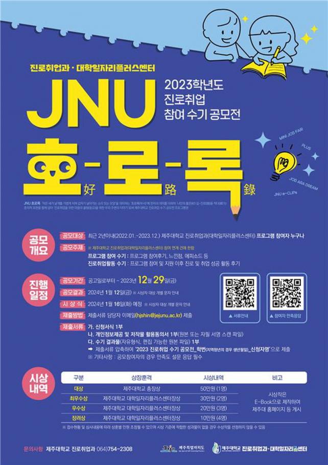 ÃÖ±Ù 2³â À̳» Á¦ÁÖ´ëÇб³ Áø·ÎÃë¾÷ ÇÁ·Î±×·¥¿¡ Âü¿©ÇÑ »ç¶÷À̶ó¸é ´©±¸³ª Âü¿©°¡´ÉÇϰí, ½É»ç¸¦ ÅëÇØ ¼±Á¤µÈ ÀÛǰÀº ÃÑÀå ¸íÀÇ Ç¥Ã¢Àå°ú ½Ã»ó±ÝÀ» Áö±ÞÇÒ ¿¹Á¤ÀÌ´Ù.