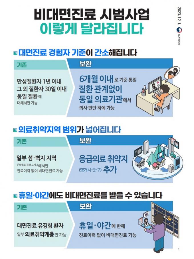 º¸°Çº¹ÁöºÎ´Â ÀÇ·á ±â¹Ý ½Ã¼³(ÀÎÇÁ¶ó) ºÎÁ· Áö¿ªÀÌ ¸¹°í, ÀÇ·áÃë¾à ½Ã°£´ë º´ÀÇ¿ø ÀÌ¿ëÀÌ ¾î·Æ´Ù´Â ÇöÀå ÀÇ°ß µîÀ» ¹Ý¿µÇØ ºñ´ë¸éÁø·á ½Ã¹ü»ç¾÷À» È®´ëÇß´Ù. ´ë¸é Áø·á °æÇèÀÚ ±âÁØ °£¼ÒÈ, ÀÇ·áÃë¾àÁö¿ª ¹üÀ§ È®´ë, ÈÞÀÏ¡¤¾ß°£¿¡ ÇÑÇØ Áø·á ÀÌ·Â ¾øÀ̵µ ºñ´ë¸é Áø·á¸¦ ¹ÞÀ» ¼ö ÀÖµµ·Ï È®´ëÇÑ °ÍÀÌ ÁÖ¿ä °ñÀÚ´Ù.