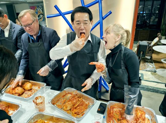 | ¹Ì±¹À» ¼ø¹æÁßÀÎ ±è¿µ·Ï Àü¶ó³²µµÁö»ç°¡ 12ÀÏ(ÇöÁö ½Ã°£) ¹Ì±¹ ´º¿å The Fight Deck¿¡¼ ÇöÁö ¹®È¿¹¼ú°è ÀÎ»ç ¹× ÇöÁö¿ä¸®»ç, ÀÎÇ÷ç¾ð¼ µîÀÌ Âü¿©ÇÑ °¡¿îµ¥ ¿¸° ¡®³²µµÀ½½Ä ¹Ì±¹ È«º¸Çà»ç¡¯¿¡¼ ¹ö¹«¸° ³²µµ±èÄ¡¸¦ ½Ã½ÄÇϰí ÀÖ´Ù. |
