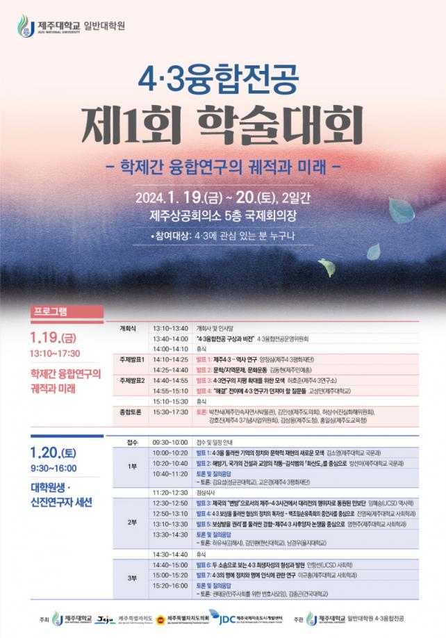 Á¦ÁÖ´ë 4¡¤3À¶ÇÕÀü°øÀº ³ÃÀü°ú Å»½Ä¹Î, µð¾Æ½ºÆ÷¶ó¿Í ¹ßÀüÁÖÀÇ µîÀÇ ¹®Á¦ÀÇ½Ä ¼Ó¿¡¼ 4¡¤3 ÀÌÀü°ú 4¡¤3 ÀÌÈĸ¦ ¤¾î³»´Â ´ÙÇÐÁ¦Àû ¿¬±¸¸¦ ÅëÇØ ¡®4¡¤3ÇС¯ÀÇ ÀÌ·ÐÀû¡¤½ÇõÀû ±â¹ÝÀ» È®¸³ÇÏ´Â °ÍÀ» ¸ñÇ¥·Î ÇÑ´Ù. ±¹³»¡¤¿Ü ¿¬±¸ÀÚÀÇ ¿¬±¸ ¼º°ú¿Í °í¹ÎÀ» °øÀ¯Çϰí 4¡¤3¿¬±¸¸¦ »çȸÀûÀ¸·Î È®»êÇϰíÀÚ ¿ù·Ê ÄÝ·ÎŰ¿òÀ» ºñ·ÔÇÏ¿© Ư° ¹× Çмú´ëȸ¸¦ Á¤±âÀûÀ¸·Î °³ÃÖÇϰí ÀÖ´Ù.
