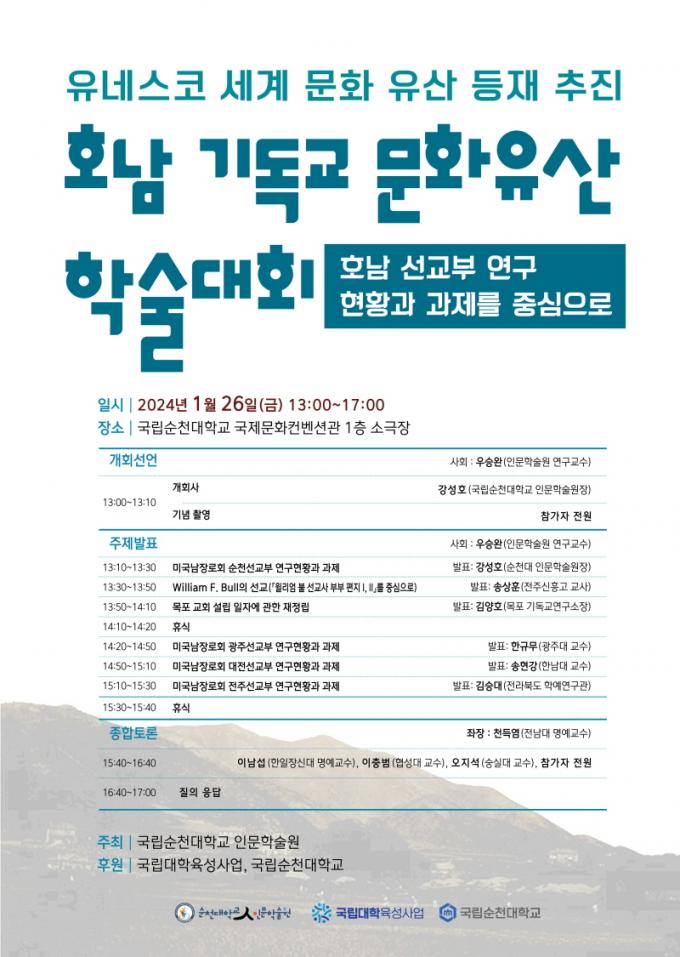 ¶ÇÇÑ, Àι®Çмú¿øÀº 2023³â 6¿ù ¼øÃµ½Ã ±âµ¶±³¿ª»ç¹Ú¹°°ü°ú °øµ¿ Çмú´ëȸ¸¦ °³ÃÖÇØ ¼øÃµÀÇ ¼±±³ ¹®ÈÀ¯»ê°ú ±Ù´ë Á¤¿øÀ» ÀçÁ¶¸íÇÑ µ¥ À̾î, 11¿ù Çѱ¹ÇÐÈ£³²ÁøÈï¿ø Áö¿øÀ» ¹Þ¾Æ ±âµ¶±³ À¯Àû °ü±¤º§Æ® Á¶¼º ¹æ¾È ½ÉÆ÷Áö¾öÀ» °³ÃÖÇÏ¿´´Ù. ¼øÃµ´ë Àι®Çмú¿øÀº ±×µ¿¾È 3±ÇÀÇ ±âµ¶±³ ¿¬±¸ÃѼ¸¦ ÃâÆÇÇß°í, 2¿ù¿¡ ³× ¹øÂ° ¿¬±¸ÃѼ ¡¸Àü³²µ¿ºÎÁö¿ª ±âµ¶±³ ¹®ÈÀ¯»ê°ú Áö¿ª»çȸ¡¹¸¦ ÃâÆÇÇÒ °èȹÀÌ´Ù.