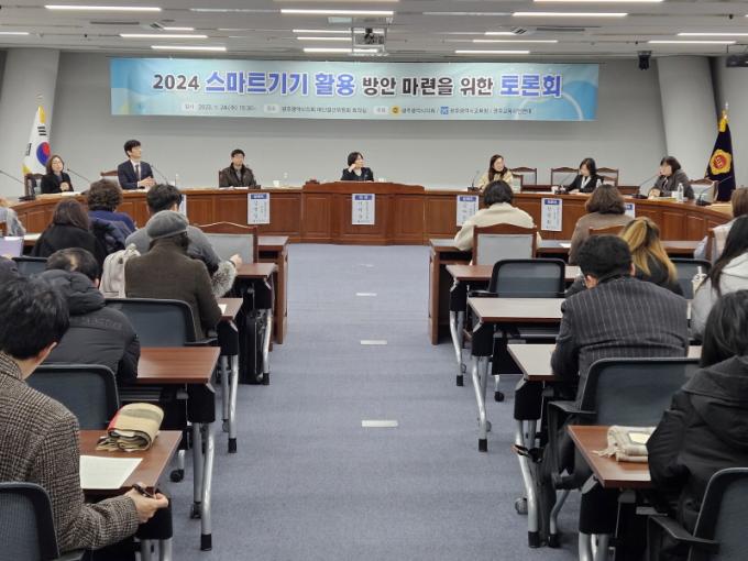 ¸ÕÀú ±è¾ÆÁø ½Ã±³À°Ã» ÀåÇаü¿Í ±èº´ÀÏ ±¤ÁÖ±³À°¿¬±¸¼Ò ÀÌ»çÀåÀÇ ¹ßÁ¦°¡ ÀÌ·ïÁ³´Ù. À̾î Çкθð, Áß¡¤°í±³ ±³»ç, ½Ã±³À°Ã» »ç¹«°ü µî ÆÐ³Î 4¸íÀÌ ½º¸¶Æ®±â±â Ȱ¿ë ¹æ¾È¿¡ ´ëÇØ ½Éµµ ÀÖ´Â Åä·ÐÀ» ÁøÇàÇß´Ù.