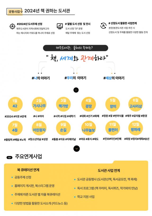 2024³â ¿ÃÇØÀÇ ÁÖÁ¦´Â¡°Ã¥, ¼¼°è¿Í °ü°èÇÏ´Ù¡±·Î Ã¥À» ÅëÇØ ³ª, ¿ì¸® ±×¸®°í °øµ¿Ã¼¶ó´Â ¼¼°è¸¦ ¿¬°áÇÏ´Â 12°³ÀÇ ¿ùº° ¼ÒÁÖÁ¦¸¦ ¼±Á¤ÇÏ¿© ºÏ Å¥·¹ÀÌ¼Ç »ç¾÷, µµ¼°ü °øµ¿Çà»ç ¹× µ¶¼¹®ÈÇÁ·Î±×·¥, Çб³Áö¿ø ¿¬°è»ç¾÷ µî °øµ¿ÀÇ ¸ñÇ¥ ¹× Á¤Ã¥ÁöÇâ°ú ÇÔ²² µµ¼°ü º° ¿¬°è»ç¾÷À» ¿î¿µÇÑ´Ù.