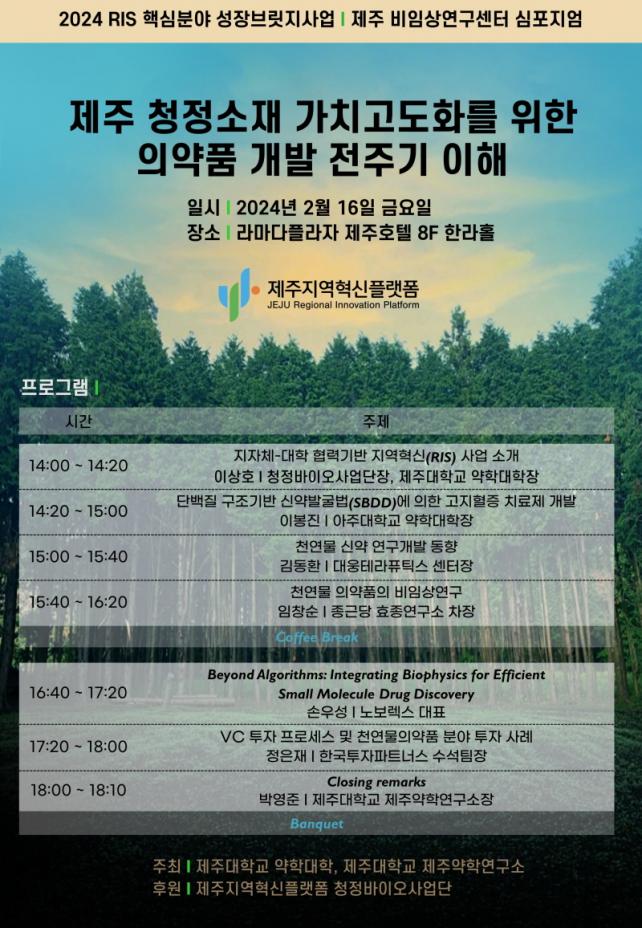 À̹ø ½ÉÆ÷Áö¾öÀº ´Ü¹éÁú ±¸Á¶±â¹Ý ½Å¾à¹ß±¼, AI¸¦ Ȱ¿ëÇÑ ¾à¹° Ç¥Àû ±Ô¸í, õ¿¬¹° ÀǾàǰ °³¹ßÀ» À§ÇÑ ºñÀÓ»ó ±âÃÊ¿¬±¸ µ¿Çâ, õ¿¬¹° ÀǾàǰ ºÐ¾ß ÅõÀÚ »ç·Ê µîÀ» Á¦ÁÖ Áö¿ª»ê¾÷ü¿¡ ¼Ò°³ÇØ Ãµ¿¬¹° ÀǾàǰ °³¹ß¿¡ ´ëÇÑ ÀÌÇØ¸¦ È®»ê½ÃÅ´À¸·Î½á Á¦ÁÖ ·¹µå¹ÙÀÌ¿À »ê¾÷ Ȱ¼ºÈ¿¡ ±â¿©ÇÏ´Â °ÍÀ» ¸ñÇ¥·Î, ±¹³» ÀǾàǰ °³¹ßÀÇ ¼±µÎÁÖÀÚµéÀÎ ¾ÆÁÖ´ëÇб³ ¾à´ë ÇÐÀå À̺ÀÁø ±³¼ö, ´ë¿õÅ×¶óǻƽ½º ¼¾ÅÍÀå ±èµ¿È¯ ¹Ú»ç, Á¾±Ù´ç È¿Á¾¿¬±¸¼Ò Â÷Àå ÀÓâ¼ø ¹Ú»ç, ³ëº¸·º½º ´ëÇ¥ ¼Õ¿ì¼º ¹Ú»ç, Çѱ¹ÅõÀÚÆÄÆ®³Ê½º ¼ö¼®ÆÀÀå Á¤ÀºÀç ¹Ú»ç°¡ °¿¬ÀÚ·Î ³ª¼±´Ù.