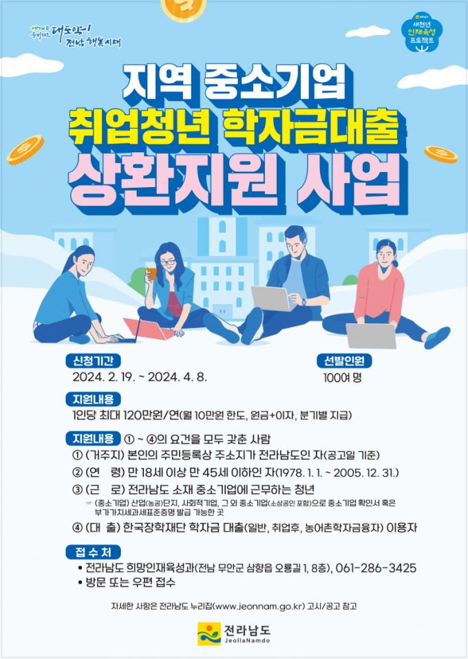 Áö¿øÀ» ¹Ù¶ó´Â û³âÀº 4¿ù 8ÀϱîÁö Àü³²µµ Èñ¸ÁÀÎÀçÀ°¼º°ú¿¡ ¹æ¹®Çϰųª ¿ìÆí(Àü³²µµ ¹«¾È±º »ïÇâÀ¾ ¿À·æ±æ 1, Àü¶ó³²µµÃ» Èñ¸ÁÀÎÀçÀ°¼º°ú)À¸·Î Á¢¼öÇÏ¸é µÈ´Ù. ¼·ù½É»ç¸¦ °ÅÃÄ 4¿ù²² Áö¿ø ´ë»óÀÚ 100¿© ¸íÀ» ¼±Á¤ÇÒ °èȹÀÌ´Ù. Áö¿ø ´ë»óÀÚ·Î ¼±Á¤µÈ û³âÀº ¼±»óȯ ÈÄÁö¿ø ¹æ½ÄÀ¸·Î ºÐ±â¸¶´Ù °³Àκ° ÇÐÀÚ±Ý ´ëÃâ »óȯ ³»¿ªÀ» È®ÀÎÇÑ ÈÄ ¿ù ÃÖ´ë 10¸¸ ¿ø, ¿¬ ÃÖ´ë 120¸¸ ¿øÀ» Áö¿ø¹ÞÀ» ¼ö ÀÖ´Ù.