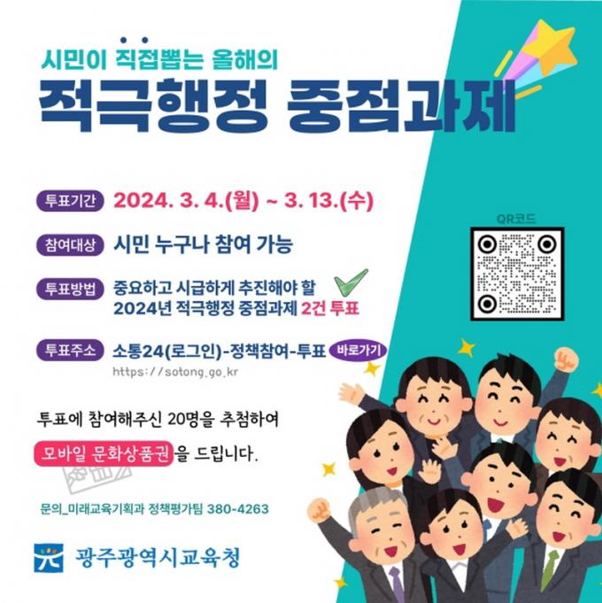 3ÀÏ ±¤Áֽñ³À°Ã»¿¡ µû¸£¸é 2024³â Àû±ØÇàÁ¤ ÁßÁ¡°úÁ¦·Î 7°Ç »ç¾÷¿¡ ´ëÇÑ ¿Â¶óÀÎ ÅõÇ¥¸¦ ½Ç½ÃÇÑ´Ù. À̸¦ ÅëÇØ ÁßÁ¡°úÁ¦ 2°ÇÀ» ÃÖÁ¾ ¼±Á¤ÇÏ°í ¿ì¼± ÃßÁøÇÔÀ¸·Î½á ½Ã¹ÎÀÌ Ã¼°¨ÇÒ ¼ö ÀÖ´Â ¼º°ú¸¦ âÃâÇÑ´Ù´Â ¹æÄ§ÀÌ´Ù.