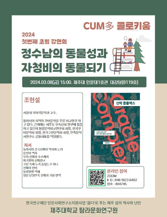 °¿¬ ÁÖÁ¦´Â <Á¤¼ö³²ÀÇ µ¿¹°¼º°ú ÀÚûºñÀÇ µ¿¹°µÇ±â>·Î, Á¦ÁÖµµ ¹«¼Ó½ÅÈ¿¡ ´ëÇÑ »õ·Î¿î ÇØ¼®À» ´ã°í ÀÖ¾î ¸Å¿ì Èï¹Ì·Î¿î ÁÖÁ¦ÀÌ´Ù. °¿¬Àº 3¿ù 8ÀÏ(±Ý) ¿ÀÈÄ 3½Ã¿¡ Á¦ÁÖ´ëÇб³ Àι®´ë 1È£°ü ´ë°´ç(8119È£)¿¡¼ ¿¸± ¿¹Á¤ÀÌ´Ù.
