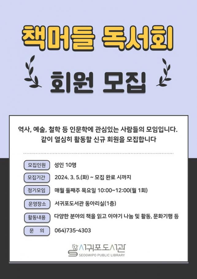 ¸ðÁý ´ë»óÀº Á¦ÁÖ¿¡ °ÅÁÖÇÏ´Â ¼ºÀÎÀ¸·Î Àι®Çп¡ °ü½ÉÀÌ ÀÖ´Â »ç¶÷ÀÌ¸é ´©±¸³ª °¡ÀÔÇÒ ¼ö ÀÖÀ¸¸ç, µ¶¼È¸ °¡ÀÔ ½Åû ¹× ¿î¿µ¿¡ ´ëÇÑ ¹®ÀÇ´Â ¼±ÍÆ÷µµ¼°ü(¢Ï735-4303)À¸·Î ÇÏ¸é µÈ´Ù.