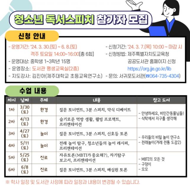 Âü°¡ ½ÅûÀº 3¿ù 7ÀÏ(¸ñ) ¿ÀÀü 10½ÃºÎÅÍ Á¦ÁÖÆ¯º°ÀÚÄ¡µµ±³À°Ã» °ø°øµµ¼°ü ȨÆäÀÌÁö(https://org.jje.go.kr/lib)¸¦ ÅëÇØ ½ÅûÇÒ ¼ö ÀÖ´Ù.