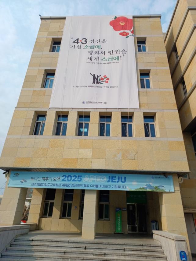 Á¦ÁÖµµ±³À°Ã»Àº 76ÁÖ³â 4¡¤3À» Ãß³äÇÏ´Â ´ëÇü Çö¼ö¸·À» º»°ü °Ç¹°¿¡ °Ô½Ã, Ãß³ä ºÐÀ§±â¸¦ È®»êÇϰí ÀÖ´Ù. Ãß³ä ¹®±¸´Â ¡° 4¡¤3ÀÇ Á¤½ÅÀ» °¡½É ¼Ò°ö¿¡, ÆòÈ¿Í ÀαÇÀ» ¼¼°è ¼Ò°ö¿¡!¡±·Î Á¦Á־ ³Ö¾î 4¡¤3ÀÇ Á¤½ÅÀÌ Àü±¹ ¹× ¼¼°è·Î È®»êµÇ±æ ±â¿øÇÏ´Â Àǹ̸¦ ´ã¾Ò´Ù.