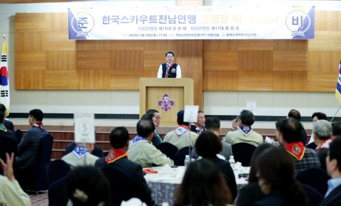 ÀÌ¡¤ÃëÀӽĿ¡´Â ±è¿µ·Ï Àü³²µµÁö»ç, ±è´ëÁß Àü³²µµ±³À°°¨, ±è¿øÀÌ ±¹È¸ÀÇ¿ø, Á¶°æ½Ä Çѱ¹½ºÄ«¿ìÆ®¿¬¸Í »ç¹«ÃÑÀå°ú Àü³²¿¬¸Í ÀÓ¿ø ¹× ´ë¿ø µî 150¿© ¸íÀÌ Âü¼®ÇØ ½ÅÀÓ È²Á¤È£ ¿¬¸ÍÀåÀÇ ÃëÀÓÀ» ÃàÇÏÇϰí ÀÌÀÓÇÏ´Â °¿ø¹è ¿¬¸ÍÀåÀÇ ³ë°í¸¦ °Ý·ÁÇß´Ù.