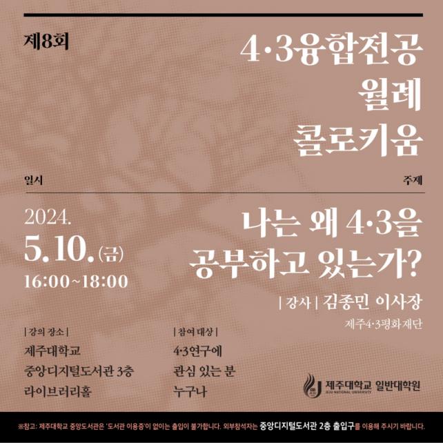 ¿©´ü ¹øÂ° 4¡¤3À¶ÇÕÀü°ø ¿ù·Ê ÄÝ·ÎŰ¿òÀº Á¦ÁÖ4¡¤3ÆòÈÀç´ÜÀÇ ±èÁ¾¹Î ½ÅÀÓ ÀÌ»çÀåÀ» ÃÊûÇÏ¿© ¡®³ª´Â ¿Ö 4¡¤3À» °øºÎÇϰí Àִ°¡?¡¯¶ó´Â ÁÖÁ¦ 4¡¤3¿¬±¸¿¡ ´ëÇÑ °í¹ÎÀ» ÇÔ²² ³ª´©´Â ÀÚ¸®·Î ¸¶·ÃÇß´Ù.