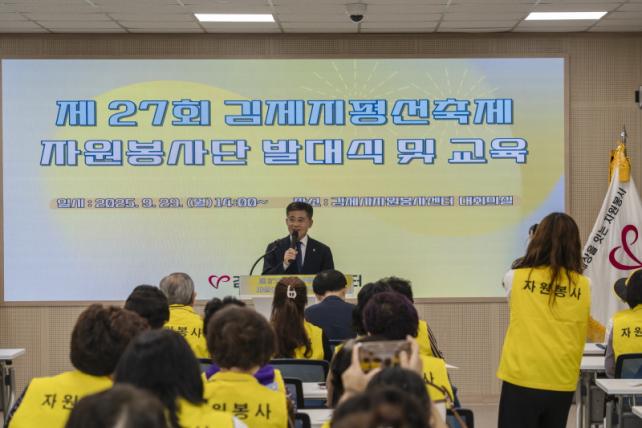 Á¤¼ºÁÖ ±èÁ¦½ÃÀåÀº °Ý·Á»ç¿¡¼ ¡°¸Å³â ¼ö½Ê¸¸ ¸íÀÌ Ã£´Â ´ëÇѹα¹ ´ëÇ¥ ³ó°æ¹®ÈÃàÁ¦¿¡¼ °ü±¤°´µéÀÌ ¾ÈÀüÇϰí ÄèÀûÇÑ ÃàÁ¦¸¦ Áñ±â°í ÁÁÀº Ãß¾ïÀ» ¸¶À½¿¡ ǰ¾î ¸Å³â ´Ù½Ã ã´Â °ÍÀº ¸ðµÎ ÀÚ¿øºÀ»çÀÚ ÇÑ ºÐ ÇÑ ºÐÀÇ Áø½É¾î¸° Ä£Àý°ú ¹è·Á ´öºÐÀÌ´Ù¡±¶ó¸ç, ¡°±èÁ¦ÁöÆò¼±ÃàÁ¦ÀÇ ¼º°ø °³ÃÖ¸¦ À§ÇØ Ç×»ó ¾Ö½á Áֽô ÀÚ¿øºÀ»çÀÚµéÀÇ ³ë°í¿¡ ¹«ÇÑÇÑ °¨»ç¸¦ ÀüÇÑ´Ù¡±°í °Ý·ÁÇß´Ù.