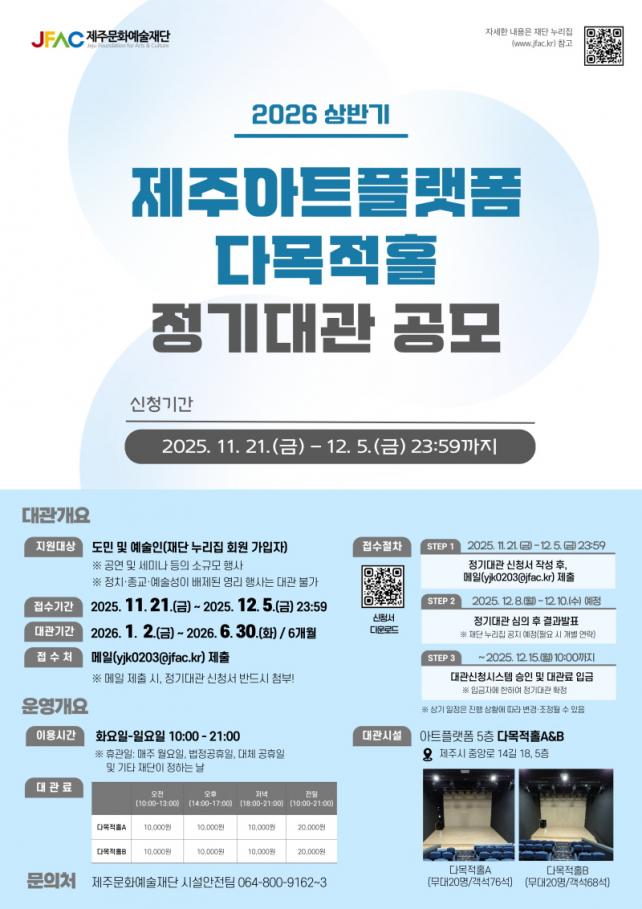 ½Åû ´ë»óÀº ¹®È¿¹¼ú °ü·Ã Çà»ç¸¦ ÁøÇàÇÏ´Â µµ¹Î ¹× ¿¹¼úÀÎÀÌ´Ù. ´ë°ü ½ÅûÀ» À§Çؼ´Â Àç´Ü ´©¸®Áý ȸ¿ø°¡ÀÔÀ» ¿Ï·áÇØ¾ß Çϸç, Á¤±â´ë°ü ½Åû¼´Â Àç´ÜÀÌ ÁöÁ¤ÇÑ Á¢¼öó À̸ÞÀÏ(yjk0203@jfac.kr)·Î Á¦ÃâÇÏ¸é µÈ´Ù. ½Åû¼ ¾ç½ÄÀº À¥Æ÷½ºÅÍ ³» QRÄÚµå ¶Ç´Â Àç´Ü ´©¸®Áý °øÁö»çÇ׿¡¼ ³»·Á¹ÞÀ» ¼ö ÀÖ´Ù.