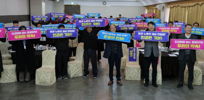 ƯÈ÷ À̳¯ Âü¼®ÀÚµéÀº ¸íǰ õÀÏ¿°À» ¿Ï¼ºÇÏ´Â ¸¶Áö¸· Á¶°ÇÀÌ ¡®»ç¶÷¡¯À̶ó´Â Á¡¿¡ ±íÀÌ °ø°¨ÇÏ¸ç ¡®ÀαÇÀÌ ¿ì¼±µÇ´Â ûÁ¤Áö¿ª Àü³²¡¯À» ´ÙÁüÇÏ´Â À뱂 Á¸Áß ¼±¾ðÀÇ ½Ã°£µµ ¸¶·ÃÇß´Ù. Âü¼®ÀÚ Àü¿øÀº ¡ã¶¡°ú ³ëµ¿ÀÇ °á½Ç õÀÏ¿°, ÀαÇÀº ±âº» ¡ã¿°Àü±Ù·ÎÀÚ´Â ¿ì¸® ÀÌ¿ô, Á¸ÁßÀÌ ¸ÕÀú ¡ãÀαÇÄ§ÇØ ¾ø´Â ûÁ¤Áö¿ª, ¿ì¸®ÀÇ ¾à¼Ó µî ±¸È£¸¦ ÇÔ²² ¿ÜÄ¡¸ç »ç¶÷ÀÌ Á¸Áß¹Þ´Â ÀÏÅÍ ¸¸µé±â¸¦ ´ÙÁüÇß´Ù.
