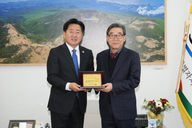 [½Ã»çÁ¾ÇսŹ® = °í¼º¹Î ±âÀÚ] Á¦ÁÖÆ¯º°ÀÚÄ¡µµ°¡ Á¦ÁÖ °íÇâ»ç¶û±âºÎÁ¦¿¡ Àû±Ø µ¿ÂüÇØ ¿Â ¹®ºÀ¸¸ Àç¿ÜÁ¦ÁÖ°æÁ¦ÀÎÃÑ¿¬ÇÕȸÀå¿¡°Ô 19ÀÏ µµÁö»ç Áý¹«½Ç¿¡¼­ °¨»çÆÐ¸¦ Àü´ÞÇß´Ù.