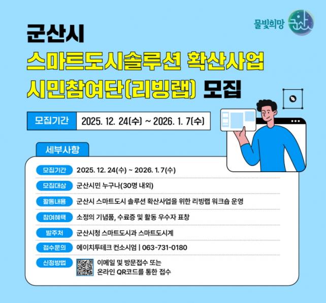¸ðÁý ´ë»óÀº ±º»ê½Ã¿¡ °ÅÁÖÇÏ´Â ½Ã¹Î ´©±¸³ª Áö¿ø °¡´ÉÇÏ´Ù. ¼±Á¤µÈ ½Ã¹ÎÂü¿©´ÜÀº ½º¸¶Æ®µµ½Ã ¼Ö·ç¼Ç È®»ê»ç¾÷ °³³ä°ú ¸®ºù·¦ ¿î¿µ¿¡ ´ëÇÑ ±âº»±³À°, ¹®Á¦ Ž»ö¡¤¾ÆÀ̵ð¾î ¹ß±¼ ȸÀÇ, ¼Ö·ç¼Ç Æò°¡ ¹× ÀÇ°ß Á¦½Ã µî ´Ù¾çÇÑ È°µ¿¿¡ Âü¿©ÇÏ°Ô µÈ´Ù.