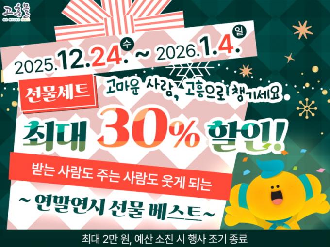 [½Ã»çÁ¾ÇսŹ® = ¿À½ÂÅà ±âÀÚ] °íÈﱺ(±º¼ö °ø¿µ¹Î)ÀÌ ¿î¿µÇÏ´Â ¿Â¶óÀÎ ³ó¼öÃàÆ¯»ê¹° ¼îÇθô ¡®°íÈï¸ô¡¯ÀÌ ¿¬¸»¿¬½Ã¸¦ ¸Â¾Æ 2026³â 1¿ù 4ÀϱîÁö ¡®°í¸¶¿î »ç¶÷, °íÈïÀ¸·Î ì±â¼¼¿ä – ¿¬¸»¿¬½Ã ¼±¹° º£½ºÆ®¡¯ ±âȹÀüÀ» ÁøÇàÇÑ´Ù.