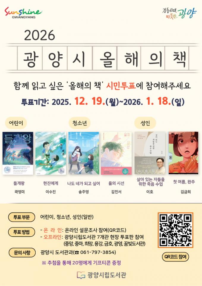 ±¤¾ç½Ã´Â Áö³ 10¿ùºÎÅÍ ½Ã¹Î, »ç¼, Çб³ µîÀ» ´ë»óÀ¸·Î µµ¼ ÃßõÀ» ¹Þ¾Æ 1Â÷ ½ÉÀǸ¦ °ÅÃÄ ºÐ¾ßº° 5±Ç¾¿ ÃÑ 15±ÇÀ» ¼±Á¤ÇßÀ¸¸ç, ÀÌÈÄ µÎ Â÷·ÊÀÇ ½Ã¹Î¼±Á¤´Ü ȸÀǸ¦ ÅëÇØ ¾î¸°ÀÌ¡¤Ã»¼Ò³â¡¤¼ºÀÎ ºÐ¾ßº° Èĺ¸ µµ¼ 2±Ç¾¿ ÃÑ 6±ÇÀ» ÃÖÁ¾ ¼±Á¤Çß´Ù.