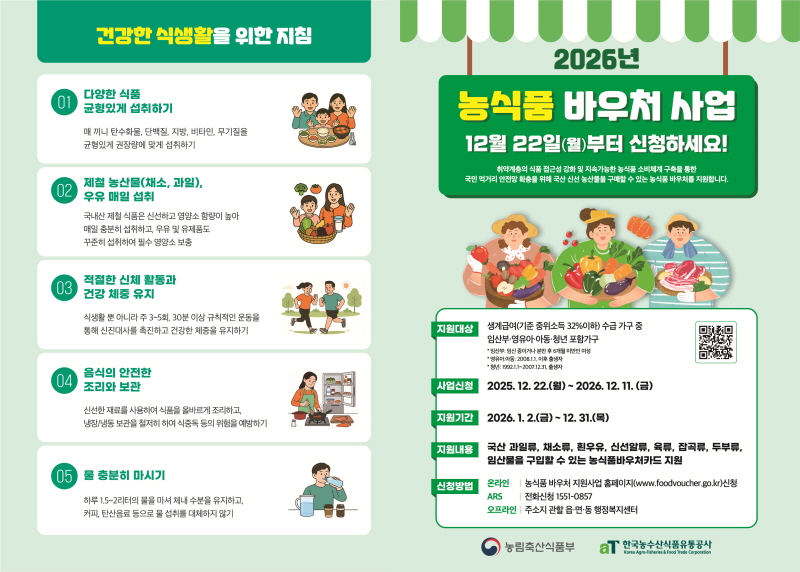 ³ó½Äǰ ¹Ù¿ìó »ç¾÷Àº »ý°è±Þ¿© ¼ö±Þ°¡±¸¸¦ ´ë»óÀ¸·Î ±¹»ê ³óÃà»ê¹°À» ±¸¸ÅÇÒ ¼ö ÀÖµµ·Ï Áö¿øÇÏ´Â ¸Ô°Å¸® µ¹º½ »ç¾÷À¸·Î, 2026³âºÎÅÍ´Â Áö¿ø ´ë»ó°ú Áö¿ø ±â°£ÀÌ ´ëÆø È®´ëµÅ º¸´Ù µÎÅÍ¿î ½Ä»ýȰ Áö¿øÀÌ ÀÌ·ïÁú Àü¸ÁÀÌ´Ù.