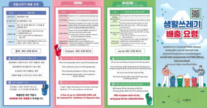 ³ªÁÖ½Ã(½ÃÀå À±º´ÅÂ)´Â ¾ð¾îÀ庮À¸·Î »ýȰÆó±â¹° ¹èÃâ¿¡ ¾î·Á¿òÀ» °Þ´Â ¿Ü±¹ÀÎÀ» ´ë»óÀ¸·Î ÀûÁ¤ ¹èÃâ ¹æ¹ýÀ» ¾È³»Çϱâ À§ÇØ Á¢ÀÌ½Ä ¸®Çø´ ÇüÅÂÀÇ ´Ù±¹¾î È«º¸¹°À» Á¦ÀÛÇß´Ù°í 2ÀÏ ¹àÇû´Ù.