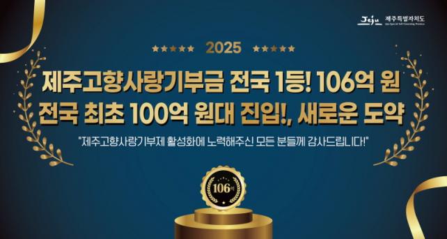 [½Ã»çÁ¾ÇսŹ® = °í¼º¹Î ±âÀÚ] Á¦ÁÖÆ¯º°ÀÚÄ¡µµ´Â 2025³â °íÇâ»ç¶û±âºÎÁ¦¸¦ ÅëÇØ ÃÑ 105¾ï 9,074¸¸ ¿ø(ÀáÁ¤)À» ¸ð±ÝÇß´Ù°í ¹àÇû´Ù. ÀÌ´Â Àü³â ´ëºñ ¾à 3¹è ¼ºÀåÇÑ ±Ô¸ð·Î, Àü±¹ 243°³ Áö¹æÀÚÄ¡´Üü Áß Ã³À½À¸·Î 100¾ï ¿ø´ë¿¡ ÁøÀÔÇÑ ±â·ÏÀÌ´Ù.