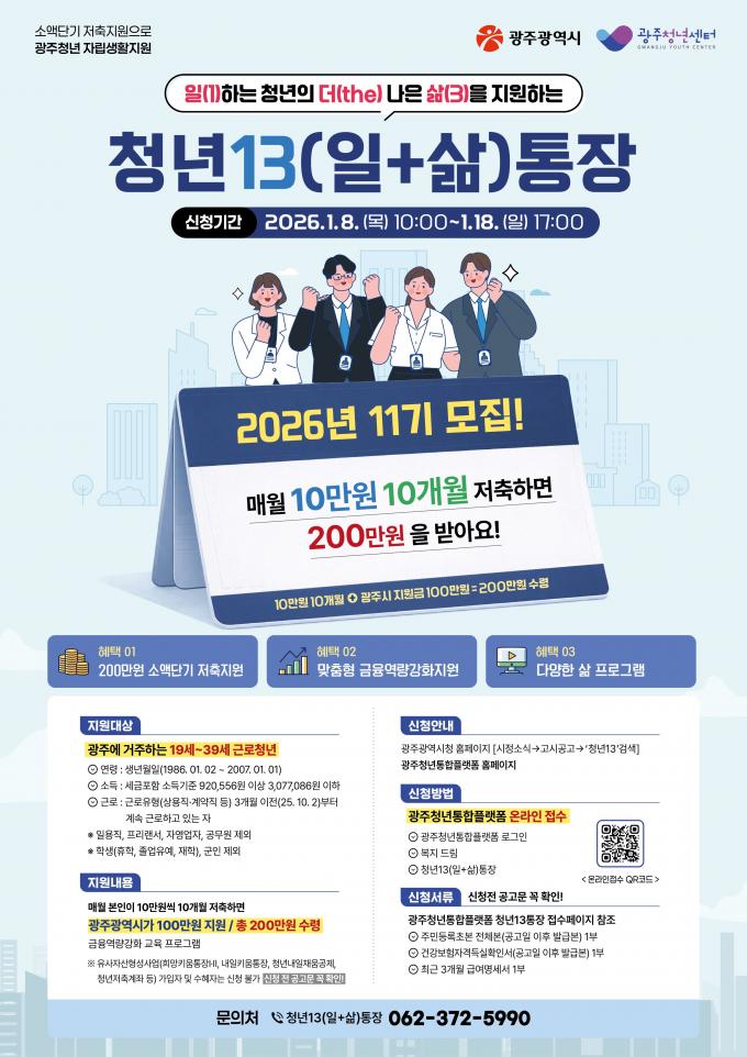 ¡®Ã»³â13ÅëÀ塯Àº 19~39¼¼ ±Ù·Îû³âÀÌ ¸Å¿ù 10¸¸¿ø¾¿ 10°³¿ù°£ 100¸¸¿øÀ» ÀúÃàÇϸé, ±¤Áֽð¡ 100¸¸¿øÀ» Áö¿øÇØ ÃÑ 200¸¸¿øÀÇ ¸¸±â±Ý°ú ÀÌÀÚ¸¦ ¸¶·ÃÇÒ ¼ö ÀÖ°Ô ÇÏ´Â ±¤Áֽà ´ëÇ¥ û³â ±ÝÀ¶ÀÚ»ê Çü¼º Áö¿ø »ç¾÷ÀÌ´Ù.