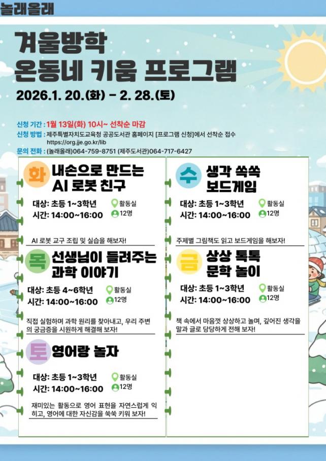 ¿î¿µ ÇÁ·Î±×·¥Àº ¸ÅÁÖ È¿äÀϺÎÅÍ Åä¿äÀÏ ¿ÀÈÄ 2½Ã¿¡ ¿äÀϺ°·Î Ư»ö ÀÖ°Ô ÁøÇàµÇ¸ç ¡âÀΰøÁö´É(AI) ·Îº¿ ÄÚµù(È) ¡âµ¶¼ º¸µå°ÔÀÓ(¼ö) ¡ââÀÇ À¶ÇÕ °úÇРȰµ¿(¸ñ) ¡âµ¶¼ ³í¼ú(±Ý) ¡â¿µ¾î ±×¸²Ã¥ ¼ö¾÷(Åä) µî ÃÑ 5°³ ºÐ¾ßÀÌ´Ù.