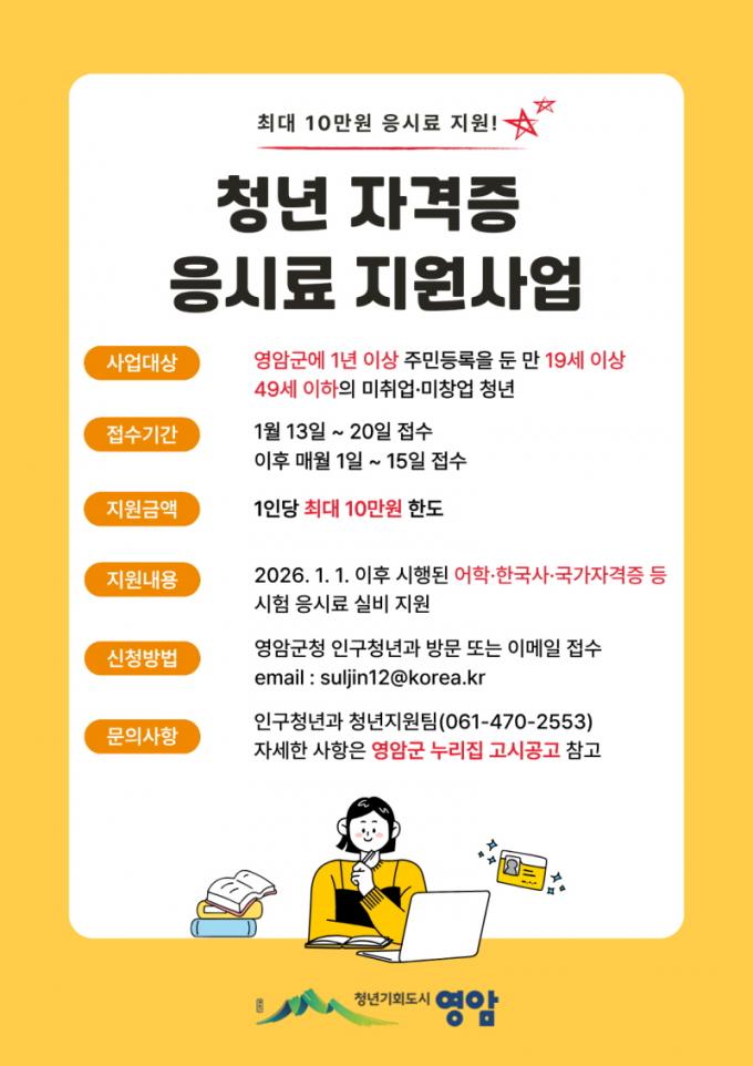 ÀÚ°ÝÁõ ÀÀ½Ã·á ½ÅûÀÏ ±âÁØ 1³â ÀÌ»ó ¿µ¾Ï±º¹ÎÀÎ ¹ÌÃë¾÷¡¤¹Ìâ¾÷ 19~49¼¼ û³âÀÌ ½ÅûÇÒ ¼ö ÀÖ°í, ¿ÃÇØ ½ÃÇàµÈ ½ÃÇè¿¡ ÀÀ½ÃÇÏ¸é ¿¹»êÀÇ ¹üÀ§ ³»¿¡¼ ¼±Âø¼øÀ¸·Î Áö¿ø¹ÞÀ» ¼ö ÀÖ´Ù. ÀÌ´Þ ½Åû Á¢¼ö´Â 20ÀϱîÁöÀ̰í, 2¿ùºÎÅÍ´Â ¸Å¿ù 1~15ÀÏÀÌ Á¢¼ö±â°£ÀÌ´Ù.