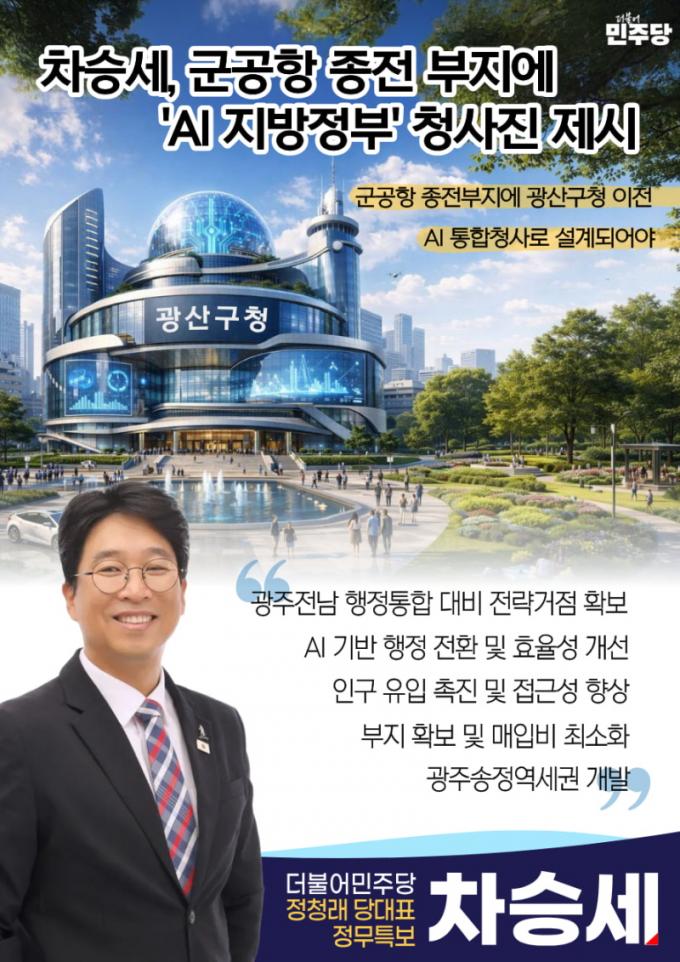 Â÷½Â¼¼ ´õºÒ¾î¹ÎÁÖ´ç Á¤Ã»·¡ ´ç´ëÇ¥ Á¤¹«Æ¯º¸´Â 15ÀÏ, ±º°øÇ× Á¾ÀüºÎÁö¸¦ Ȱ¿ëÇÑ ±¤»ê±¸ ½Åû»ç °Ç¸³À» °ø½Ä Á¦¾ÈÇϸç, À̸¦ ±¤»êÀÇ ¹Ì·¡ 100³âÀ» ¼³°èÇÏ´Â ÇÙ½É Çõ½Å°úÁ¦·Î »ï¾Æ¾ß ÇÑ´Ù°í ¹àÇû´Ù.