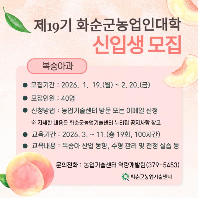 [½Ã»çÁ¾ÇսŹ® = ¿À½ÂÅà ±âÀÚ] È­¼ø±º(±º¼ö ±¸º¹±Ô)Àº ¿À´Â 1¿ù 19ÀϺÎÅÍ 2¿ù 20ÀϱîÁö Áö¿ª ³ó¾÷ÀÇ Áö¼Ó °¡´ÉÇÑ ¼ºÀå°ú ¹Ì·¡ ³ó¾÷À» À̲ø Àü¹® Àη ¾ç¼ºÀ» À§ÇØ 2026³âµµ Á¦19±â È­¼ø±º³ó¾÷ÀδëÇÐ ½ÅÀÔ»ýÀ» ¸ðÁýÇÑ´Ù°í ¹àÇû´Ù.