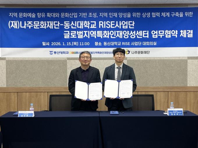 ³ªÁÖ¹®ÈÀç´Ü(ÀÌ»çÀå À±º´ÅÂ)Àº µ¿½Å´ëÇб³ RISE»ç¾÷´Ü ±Û·Î¹úÁö¿ªÆ¯ÈÀÎÀç¾ç¼º¼¾ÅÍ(¼¾ÅÍÀå ÀÓ¼øÈ£)¿Í Áö³ 15ÀÏ Áö¿ª ¹®È¿¹¼ú ÇâÀ¯ È®´ë¿Í ¹®È»ê¾÷ ±â¹Ý Á¶¼º, û³â ÀÎÀç ¾ç¼ºÀ» À§ÇÑ ¾÷¹«Çù¾àÀ» ü°áÇß´Ù°í 16ÀÏ ¹àÇû´Ù.