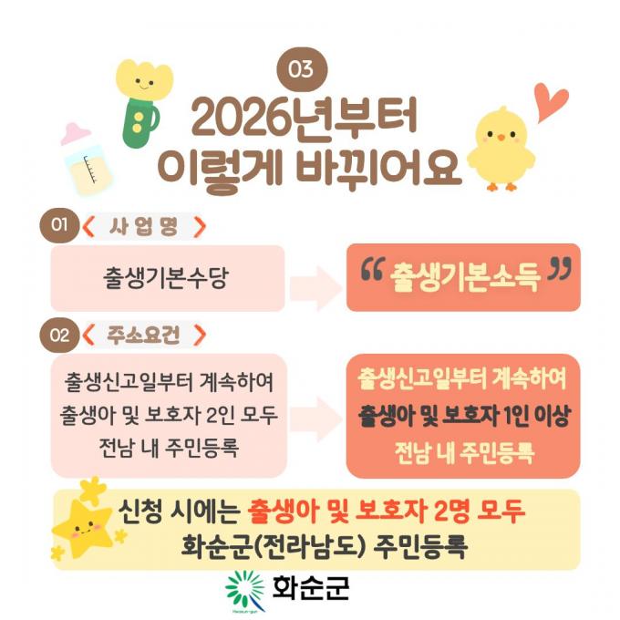 [½Ã»çÁ¾ÇսŹ® = ¿À½ÂÅà ±âÀÚ] È­¼ø±º(±º¼ö ±¸º¹±Ô)Àº 20ÀÏ Ãâ»ê Àå·Á¿Í ¾çÀ° ȯ°æ °³¼±À» À§ÇØ ¡®Ãâ»ý±âº»¼Òµæ Áö¿ø»ç¾÷¡¯ÀÇ ½Åû ÀÚ°ÝÀ» 2026³âºÎÅÍ ´ëÆø ¿ÏÈ­ÇØ ÃßÁøÇÑ´Ù°í ¹àÇû´Ù.