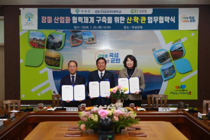 ƯÈ÷, À̹ø Çù¾àÀº ´ëÇÐ Áö¿ø ü°èÀÎ ¡®¶óÀÌÁî(RISE, Áö¿ªÇõ½ÅÁ᫐ ´ëÇÐÁö¿øÃ¼°è)¡¯ »ç¾÷°ú ¿¬°èÇØ ÃßÁøµÈ´Ù´Â Á¡¿¡¼ Àǹ̰¡ Å©´Ù. Àü³²°úÇдëÇб³´Â Àå¹Ì ¼ÒÀç ¿¬±¸¿Í ÇÔ²² °ü·Ã ºÐ¾ß ÇлýµéÀ» Áö¿ª Á¤ÁÖÇü ÀÎÀç·Î ¾ç¼ºÇϰí, ¢ßÃ»ÈÆÊÀº º¸À¯ÇÑ ±â¼ú·ÂÀ» ¹ÙÅÁÀ¸·Î ½ÇÁúÀûÀÎ Á¦Ç° »ý»ê°ú ǰÁú °ü¸®·Î »ê¾÷ÈÀÇ ¹°²¿¸¦ ư´Ù. °î¼º±ºÀº À̸¦ µÞ¹ÞħÇÒ ÇàÁ¤Àû Áö¿ø°ú ÀÎÇÁ¶ó Á¶¼º¿¡ ÁýÁßÇÑ´Ù. À̳¯ Çù¾à½Ä¿¡¼´Â ¼¼ ±â°üÀåÀÌ ¼·Î ´Ù¸¥ °÷¿¡¼ ÀÚ¶õ Àå¹Ì ¼¼ ¼ÛÀ̸¦ ÇϳªÀÇ Èº´¿¡ ²È´Â ¡®ÈÇÕÀÇ ²Éº´¡¯ ÆÛÆ÷¸Õ½º¸¦ ¼±º¸¿© ´«±æÀ» ²ø¾ú´Ù. ÀÌ´Â ÇàÁ¤, ±³À°, ±â¾÷ÀÌ Çϳª µÇ¾î ¡®°î¼º Àå¹Ì»ê¾÷¡¯À̶ó´Â Å« ²ÉÀ» ÇÇ¿ì°Ú´Ù´Â °·ÂÇÑ ÀÇÁö¸¦ ½Ã°¢ÀûÀ¸·Î Ç¥¸íÇÑ °ÍÀÌ´Ù. °î¼º±º °ü°èÀÚ´Â ¡°À̹ø Çù¾àÀº °î¼º Àå¹Ì°¡ ´Ü¼øÇÑ °ü±¤ ÀÚ¿øÀ» ³Ñ¾î °íºÎ°¡°¡Ä¡ »ê¾÷À¸·Î µµ¾àÇϴ ù°ÉÀ½¡±À̶ó¸ç ¡°´ëÇÐÀÇ ¿¬±¸ ¿ª·®°ú ±â¾÷ÀÇ ³ëÇÏ¿ì, ÇàÁ¤ÀÇ Áö¿øÀÌ °áÇÕµÈ ¼º°øÀûÀÎ »êÇаü Çù·Â ¸ðµ¨À» ¸¸µé¾î ³»°Ú´Ù¡±¶ó°í ¹àÇû´Ù.
