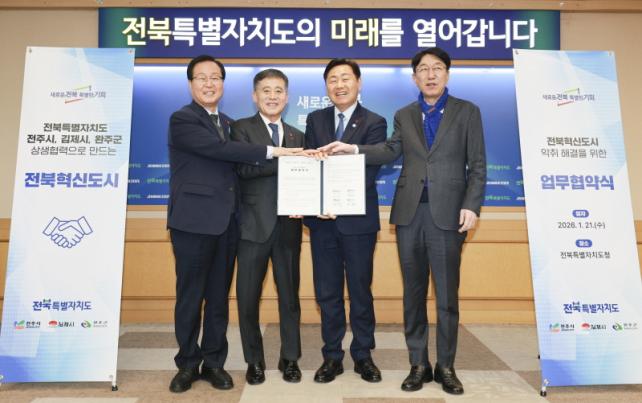 µµ´Â 21ÀÏ µµÃ» 4Ãþ ȸÀǽǿ¡¼ ±è°ü¿µ ÀüºÏÀÚÄ¡µµÁö»ç¿Í ¿ì¹ü±â ÀüÁÖ½ÃÀå, Á¤¼ºÁÖ ±èÁ¦½ÃÀå, À¯ÈñÅ ¿ÏÁÖ±º¼ö°¡ Âü¼®ÇÑ °¡¿îµ¥ Çõ½Åµµ½Ã ¾ÇÃë ÇØ°áÀ» À§ÇÑ ¾÷¹«Çù¾àÀ» ü°áÇß´Ù. À̹ø Çù¾àÀº »ç¾÷ ´ë»óÁö¿ªÀÎ ±èÁ¦½Ã¿Í Çõ½Åµµ½Ã°¡ À§Ä¡ÇÑ ÀüÁÖ½Ã, ¿ÏÁÖ±ºÀÌ ÇÔ²² Àç¿øÀ» ºÎ´ãÇÏ´Â ¹æ½ÄÀ¸·Î, Áö¿ª ȯ°æ Çö¾È¿¡ °øµ¿ ´ëÀÀÇÑ´Ù´Â Á¡¿¡¼ Àǹ̰¡ Å©´Ù.
