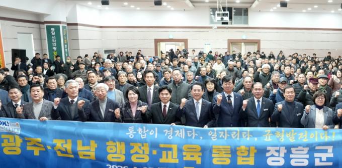 °øÃ»È¸¿¡¼± ±è¿µ·Ï Àü³²µµÁö»ç°¡ ÀåÈﱺ¹Îȸ°üÀ» °¡µæ ¸Þ¿î 500¿© ¸íÀÇ µµ¹Î¿¡°Ô ±¤ÁÖ¡¤Àü³² ÅëÇÕ¿¡ µû¸¥ À塤´Ü±âº° µµ¹Î »îÀÇ º¯È¿Í ±â¾÷ À¯Ä¡, ÀÏÀÚ¸® Ȱ¼ºÈ ³ë·ÂÀ» ÁßÁ¡ ¼³¸íÇß´Ù. µµ¹ÎµéÀº ÅëÇÕ ÀÌÈÄ Áö¿ª Á¤Ã¼¼º °È¿Í ¹ßÀüÀü·« ½ÇÇà, ³ó¾îÃÌ µî ³«ÈÄÁö¿ªÀÇ Á¤Ã¥Àû ¹è·Á Çʿ伺 µî ÀǰßÀ» °¡°¨ ¾øÀÌ Á¦½ÃÇÏ¸ç °ø·ÐÀÇ ÀåÀ» ÆîÃÆ´Ù.