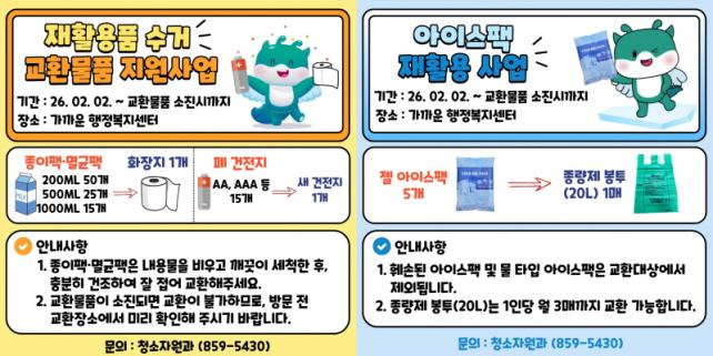 26ÀÏ ÀÍ»ê½Ã¿¡ µû¸£¸é ÀçȰ¿ëǰ ¼ö°Å ±³È¯¹°Ç° Áö¿ø»ç¾÷Àº 2¿ù 2ÀϺÎÅÍ ¿î¿µÀ» ½ÃÀÛÇϸç, ½Ã¹Î ´©±¸³ª °¡±î¿î À¾¡¤¸é¡¤µ¿ ÇàÁ¤º¹Áö¼¾Å͸¦ ¹æ¹®ÇØ Âü¿©ÇÒ ¼ö ÀÖ´Ù.
