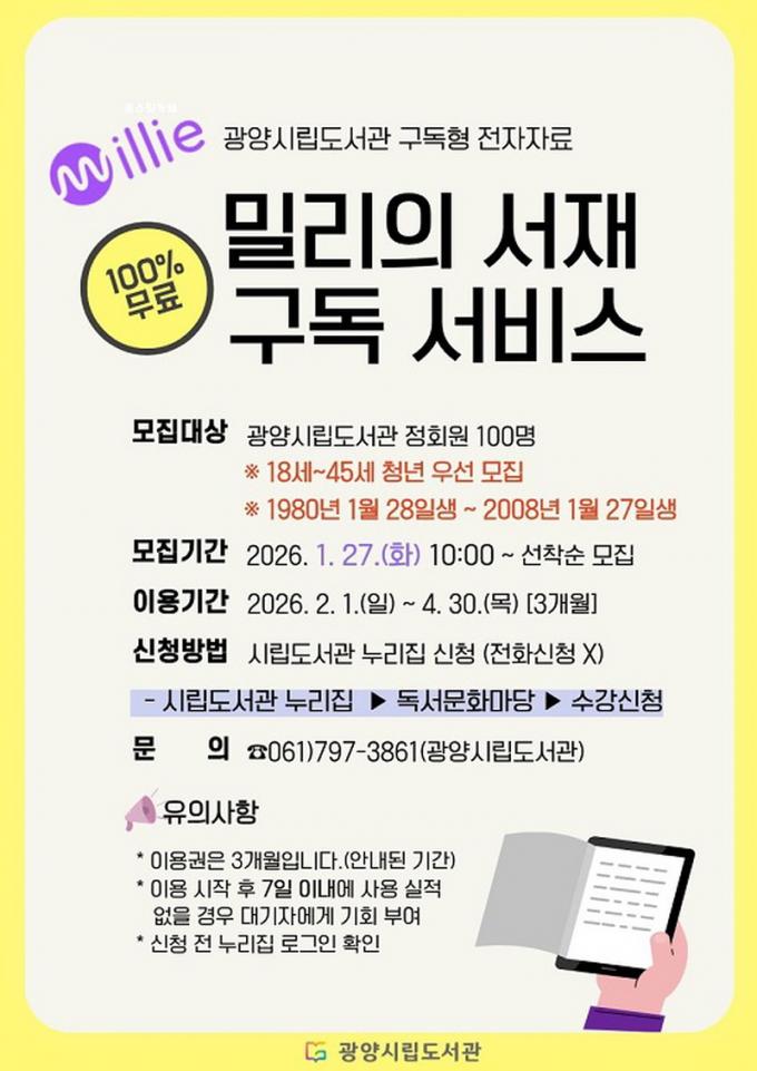 1ºÐ±â Âü¿©ÀÚ ¸ðÁýÀº 1¿ù 27ÀÏ È¿äÀÏ ¿ÀÀü 10½ÃºÎÅÍ ¼±Âø¼øÀ¸·Î ÁøÇàµÈ´Ù. ½ÅûÀº ±¤¾ç½Ã¸³µµ¼°ü ´©¸®ÁýÀÇ ¡®µ¶¼¡¤¹®È¸¶´ç¡¯ ³» ¼ö°½Åû ¸Þ´º¿¡¼ °¡´ÉÇϸç, ÀÚ¼¼ÇÑ »çÇ×Àº ±¤¾çÁß¾Óµµ¼°ü(¢Ï061-797-3861)À¸·Î ¹®ÀÇÇÏ¸é µÈ´Ù.