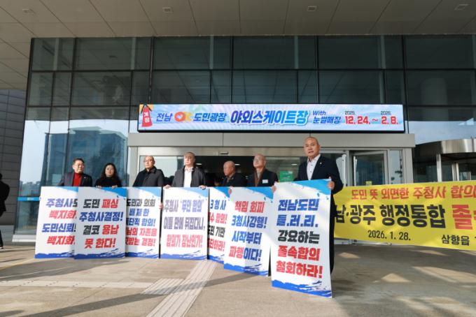 ±ºÀÇȸ´Â ÇöÀå¿¡¼ ¡°Àü³²µµÃ»ÀÌ À§Ä¡ÇÑ ¹«¾ÈÀ» ¿Ü¸éÇÑ ÁÖû»ç ³íÀÇ´Â Àü³²µµ¹Î¿¡ ´ëÇÑ ¸í¹éÇÑ È¦´ë¡±¶ó¸ç ¡°µµ¹Î°ú ÀÇȸÀÇ ÀǰßÀÌ ¹èÁ¦µÈ 3û»ç üÁ¦ °ÇàÀº Á¤Ä¡Àû °Å·¡¿¡ ÀÇÇÑ ¹Ð½Ç ÇÕÀÇ¡±¶ó°í ºñÆÇÇß´Ù.