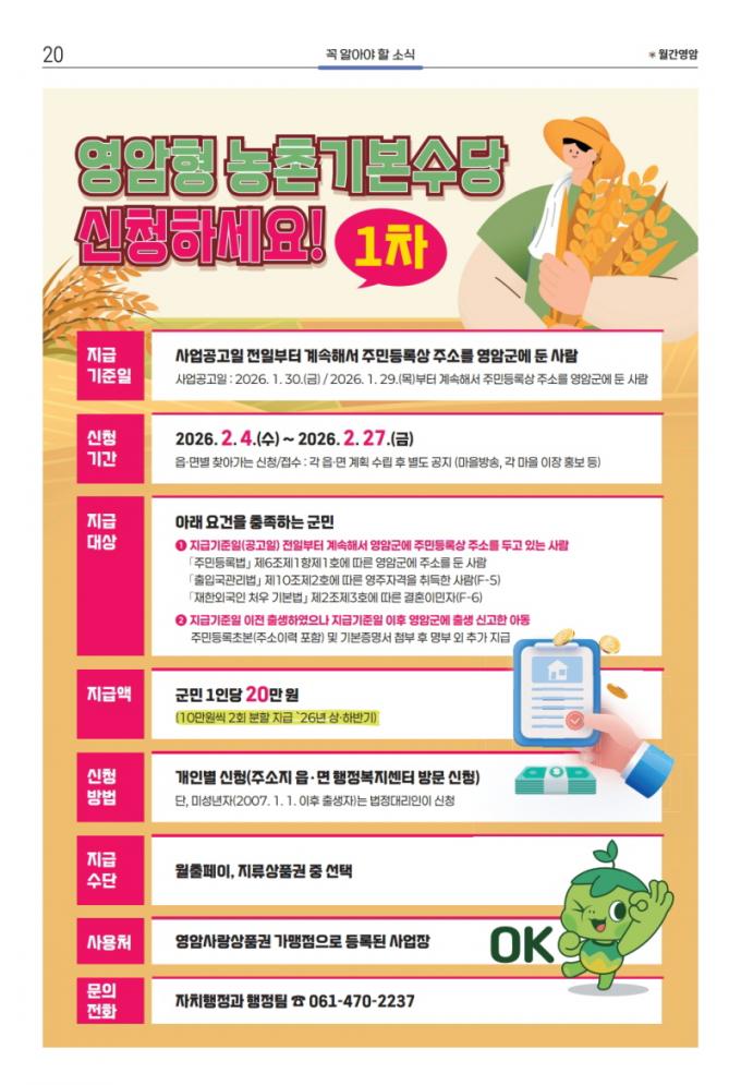 À̹ø 1Â÷ ³óÃ̱⺻¼ö´çÀº Áֹεî·Ï»ó ¿ÃÇØ 1/29ÀϺÎÅÍ ¿µ¾Ï±º¹ÎÀÎ »ç¶÷¿¡°Ô 1Àδç 10¸¸¿øÀ» Áö±ÞÇϰí, °áÈ¥À̹ÎÀÚ(F-6), ¿µÁÖÀÚ°Ý ÃëµæÀÚ(F-5)µµ Æ÷ÇԵȴÙ. ¼ö´ç ½ÅûÀº 4ÀϺÎÅÍ ÁÖ¼ÒÁö À¾¡¤¸éÇàÁ¤º¹Áö¼¾Å͸¦ ¹æ¹®ÇØ ÇÒ ¼ö ÀÖ°í, °í·ÉÀÚ¡¤°Åµ¿ºÒÆíÀÚ µîÀº ¸¶À» ´ã´çÀÚ°¡ ã¾Æ°¡ Áö±ÞÇÏ´Â ¹æ½Äµµ º´ÇàµÈ´Ù.