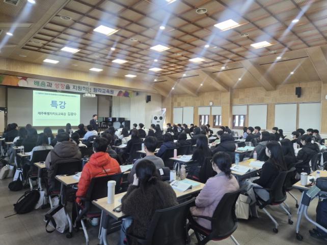 Àü¾ç¼÷ ޶ó±³À°¿øÀåÀº ¡°±³Á÷¿¡ ù¹ßÀ» ³»µó´Â ±³»çµéÀÌ Á¦ÁÖ ±³À°ÀÇ ºñÀüÀ» °øÀ¯Çϰí Çб³ ÇöÀå¿¡ ¾ÈÁ¤ÀûÀ¸·Î ¾ÈÂøÇÒ ¼ö ÀÖµµ·Ï µ½´Â °ÍÀÌ À̹ø ¿¬¼öÀÇ Çٽɡ±À̶ó¸ç ¡°½Å±Ô ±³»çµéÀÌ Àںνɰú Àü¹®¼ºÀ» °®Ãá ±³À°ÀÚ·Î ¼ºÀåÇÏ¿© Á¦ÁÖ ±³À°ÀÇ ÁúÀ» ³ôÀÌ´Â µçµçÇÑ ¹öÆÀ¸ñÀÌ µÇ±â¸¦ ±â´ëÇÑ´Ù¡±¶ó°í ¹àÇû´Ù.