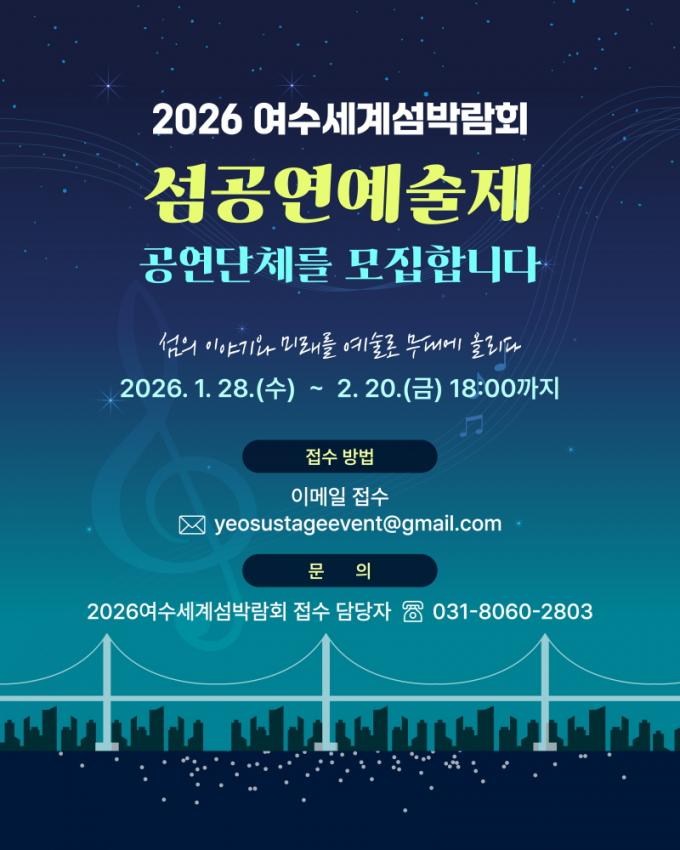 Á¶Á÷À§´Â ¿©¼ö Áö¿ª ¿¹¼ú´Üü¸¦ Æ÷ÇÔÇØ ÃÑ 4°³ ÆÀÀ» ¼±Á¤ÇÑ´Ù. ¼±Á¤µÇ¸é Ưº°°ø¿¬Àå¿¡¼ °¢ ÆÀ´ç 4ȸ ³»¿ÜÀÇ °ø¿¬À» ¼±º¸ÀδÙ. ¼±Á¤µÈ °ø¿¬´Üü¿¡´Â ÀÛǰ´ç ÃÖ´ë 3õ¸¸ ¿ø ³»¿ÜÀÇ °ø¿¬·á¸¦ Â÷µî Áö¿øÇÑ´Ù. °ø¿¬¿¡ ÇÊ¿äÇÑ ¹«´ë ±âº»½Ã¼³, À½Ç⡤Á¶¸í ½Ã½ºÅÛ°ú °ø½Ä È«º¸ ä³ÎÀ» Ȱ¿ëÇÑ È«º¸ Áö¿øµµ ÇÔ²² Á¦°øÇÑ´Ù. Á¢¼ö´Â ÀÌ´Þ 20ÀÏ ±îÁö·Î ÀüÀÚ¿ìÆíÀ» ÅëÇØ¼¸¸ ½Åû °¡´ÉÇÏ´Ù. Á¶Á÷À§´Â ¼·ù½É»ç¿Í ¹ßÇ¥½É»ç¸¦ °ÅÃÄ ÃÖÁ¾ °ø¿¬´Üü¸¦ ¼±Á¤ÇÑ´Ù. °ø¸ð °á°ú´Â 2026³â 3¿ù 27ÀÏ °³º° Å뺸 ¹× ¼¶¹Ú¶÷ȸ ´©¸®ÁýÀ» ÅëÇØ ¹ßÇ¥ÇÒ ¿¹Á¤ÀÌ´Ù.