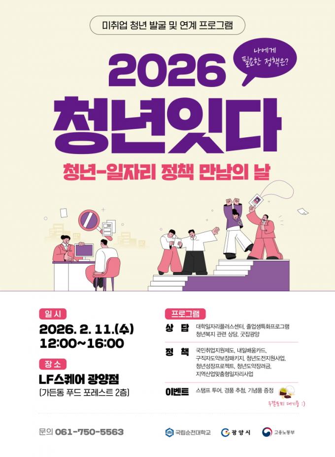 [½Ã»çÁ¾ÇսŹ® = Àå¹Î±Ô ±âÀÚ] ±¹¸³¼øÃµ´ëÇб³ ´ëÇÐÀÏÀÚ¸®Ç÷¯½º¼¾ÅÍ´Â Áö¿ª ¹ÌÃë¾÷ û³âÀ» ´ë»óÀ¸·Î û³â ÀÏÀÚ¸® Á¤Ã¥°ú Ãë¾÷ Áö¿ø Á¤º¸¸¦ Á¦°øÇÏ´Â ÇöÀåÇü Çà»ç ¡¸2026 û³â ÀÕ´Ù(û³â-ÀÏÀÚ¸® Á¤Ã¥ ¸¸³²ÀÇ ³¯)¡¹¸¦ ¿À´Â 2¿ù 11ÀÏ ¿ÀÈÄ 12½ÃºÎÅÍ 4½Ã±îÁö LF½ºÄù¾î ±¤¾çÁ¡ °¡µçµ¿ 2Ãþ¿¡¼­ °³ÃÖÇÑ´Ù.