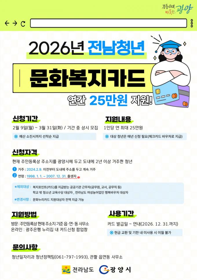Àü³²Ã»³â ¹®Èº¹ÁöÄ«µå Áö¿ø»ç¾÷Àº Àü¶ó³²µµ¿¡ °ÅÁÖÇϴ û³â¿¡°Ô üũīµå ¹Ù¿ìó ¹æ½ÄÀÇ ¹®Èº¹ÁöÄ«µå¸¦ Áö±ÞÇÏ´Â »ç¾÷À¸·Î, 1ÀÎ´ç ¿¬ ÃÖ´ë 25¸¸ ¿øÀ» Áö¿øÇÑ´Ù.